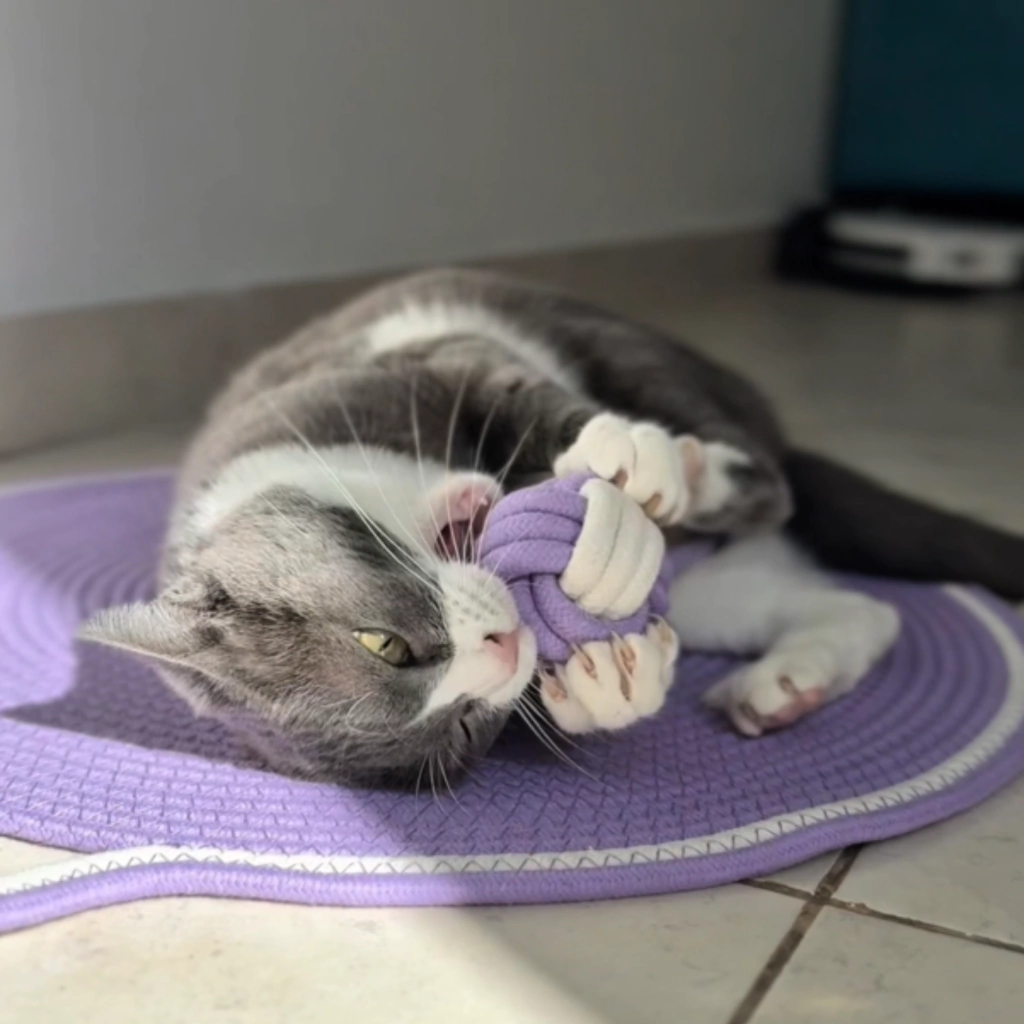 Si tu michi ya hizo de tus muebles su rascador personal, esta alfombra es la solución perfecta. Hecha a mano con cuerda de algodón natural, es resistente, fácil de limpiar y, a diferencia de los rascadores de cartón, no deja la casa llena de pedacitos.